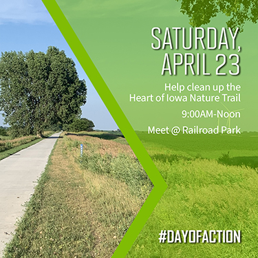 Join Friends of Huxley and Huxley Parks & Recreation from 9:00 AM to Noon on Saturday, April 23, 2022 for our #DayOfAction event: Heart of Iowa Nature Trail clean-up.