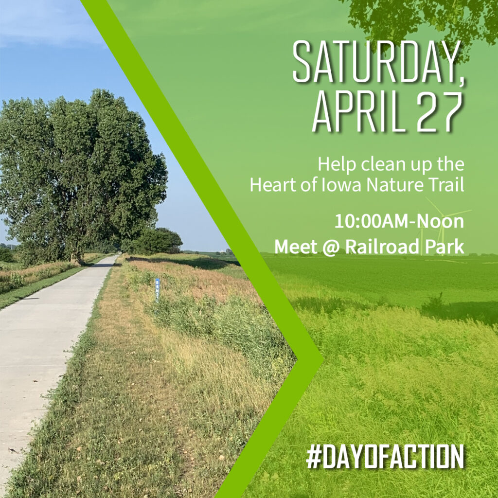 Join Friends of Huxley and Huxley Parks & Recreation from 10:00 AM to Noon on Saturday, April 27, 2024 for our #DayOfAction event: Heart of Iowa Nature Trail clean-up.